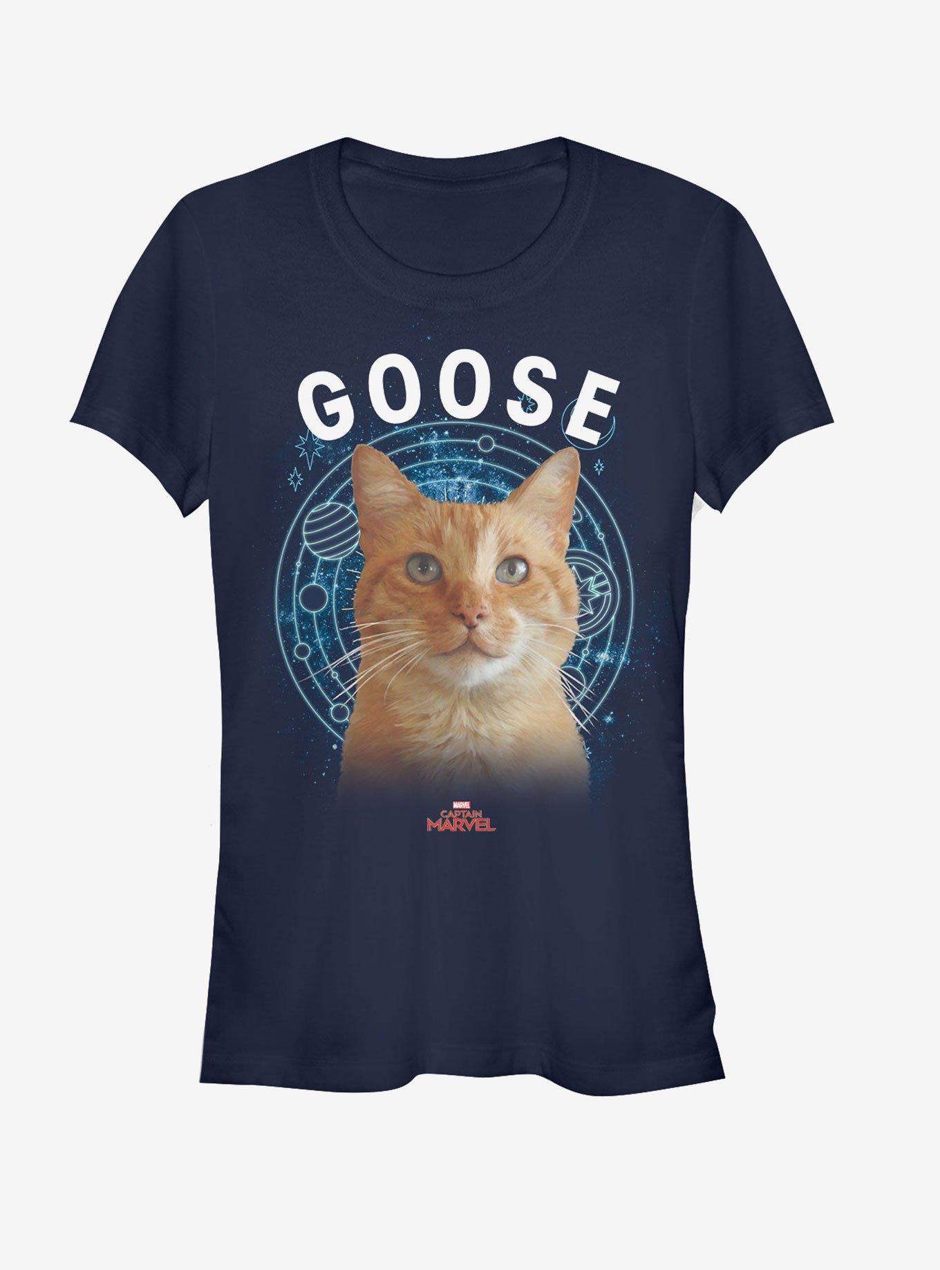 It features two images of Goose the deadly Flerken from the Marvel movie Captain Marvel with the word Goose in gold letters and a blue-outline version of Captain Marvels logo. Featuring a blown-up i. Navy 100 Super Soft Ringspun Cotton Juniors Tee for a body-hugging slim fit Womens T-shirt.
